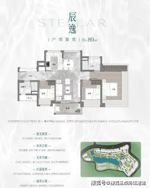 2. 建面约89㎡三房两厅两卫(塔楼户型):该户型为刚需主力户型,布局科学合理,动静分区明确,适合三口之家居住。户型南北通透,采光通风效果好,客厅宽敞明亮,连接景观阳台,可欣赏湖景或园林景观;主卧朝南,配备独立卫生间和飘窗,私密性强,居住舒适度高;两个次卧空间适中,可作为儿童房和老人房使用;厨房U型设计,动线合理,方便烹饪;公共卫生间干湿分离,满足家人日常使用需求。该户型实用性强,兼顾刚需与舒适度,是刚改群体的热门选择。