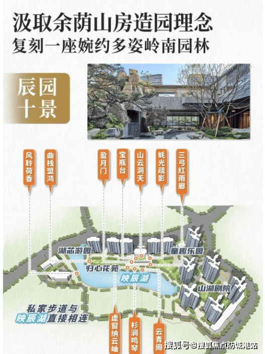 内部配套设施:项目不惜投入重金于公区设计,打造了极具仪式感的三进阶归家动线,让业主回家成为一种享受。一进阶是超70米宽的“山河如意门”,作为天河东最大的书卷式“主门楼”,前望山后邻水,融合岭南老书院与名园的韵味,寓意家族绵延、家业如意,庄重且有吉祥之意。二进阶是会所大堂“余荫山堂”,双层会所定制了一套“独家生活场域”,涵盖会客厅、文昌阁、健身区、艺术门厅等多元功能,设计深得岭南名园“余荫山房”之遗韵,细节处尽显匠心,如祥云屏风、“开枝散叶”窗花纹样、云水交融造型吊灯、烫金手绘园林四季图等,既雅致又蕴含美好祝福。三进阶是沉浸式的下沉庭院“中天云庭”,以宋代《万壑松风图》为蓝本,用叠石、瀑布和松林,造出山水画般的立体园林,庭院布局稳重挺拔,水流潺潺,象征福气汇聚。