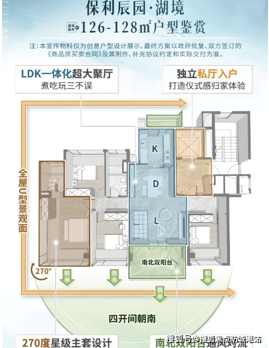 5. 建面约126-128㎡四房两厅两卫(全南T2板楼户型):该户型为改善主力户型,也是板块内唯一不超过豪宅线㎡”的小高层板楼产品,适合追求高品质湖居生活的改善家庭。户型为全南T2板楼设计,可极致延长南向面宽,规划更多南向开间,且户户单边位,直接造出L型转角空间,采光通风效果极佳;专梯入户+专属侯梯厅设计,提升私密性与仪式感;南北通透,270°俯瞰一线湖景,视野开阔,推窗即可欣赏映辰湖湖景与周边山湖林海景观;主卧套房设计,配备独立卫生间、衣帽间和超大飘窗,居住舒适度极高;其余三个房间空间宽敞,可灵活改造,满足家庭多样化需求;厨房空间充足,动线合理,适合家庭烹饪;公共卫生间干湿分离,设计人性化。该户型兼具品质与实用性,让总价预算不到1000万的买家也能享受高端湖居改善生活。