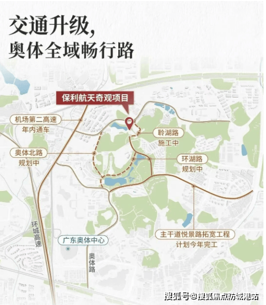 路网升级方面,依托十五届全运会的举办,奥体板块乃至整个广州的交通升级正全速推进,总投资680亿元,实施80个道路项目建设,打通“六横七纵”交通主动脉。今年,主干道悦景路拓宽工程即将完工,日后联通奥体路可直上机场第二高速;聆湖路正在规划中,建成后,业主沿聆湖路可直接去往大观街,快速接入大观中路主干道,前往智慧城片区,进一步提升出行效率。此外,项目周边还有多条公交线路经过,可满足业主日常短途出行需求,整体交通配套日趋完善,便捷通达全城。