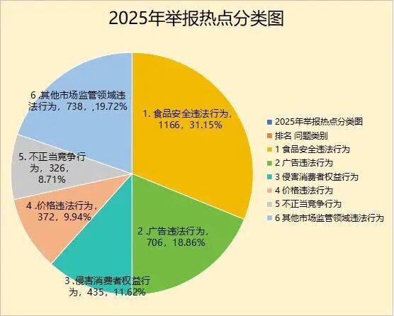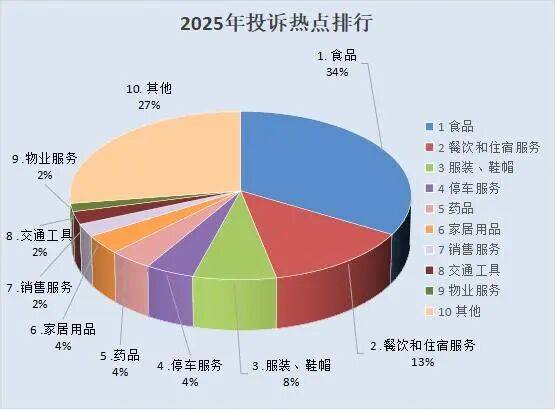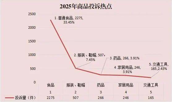 2025年,全市12315平台受理消费者投诉6802件,其中:食品2275件,占投诉总数的33.45%;餐饮和住宿服务909件,占投诉总数的13.36%;服装、鞋帽507件,占投诉总数的7.45%;停车服务299件,占投诉总数的4.40%;药品266件,占投诉总数的3.91%;家居用品246件,占投诉总数的3.62%;销售服务166件,占投诉总数的2.44%;交通工具165件,占投诉总数的2.43%;物业服务107件,占投诉总数的1.57%;其他方面的投诉1862件,占投诉总数的27.37%。投诉总量较上年度同比上升5.77%,分析原因:一是12315投诉举报程序更加便捷,消费者的诉求渠道更加畅通,通过12315平台进行投诉举报成为消费者维权的主要途径。二是区域经济发展积极向好,投诉举报量增加侧面反映出消费活动活跃,商业交易量增长。三是消费者综合素质提高,维权意识不断增强,遇到消费纠纷进行投诉举报已成为常态。四是全市电子商务发展迅速,电商经营户不断增加,网上交易量逐年增长,受经营商能力水平限制,商品介绍不准确、宣传用语不规范,造成投诉量在一定程度上增加。五是本地一些经营商对初级农产品和土特产商品的标识不规范,没有标明生产日期、保质期、联系电话等信息,引起消费纠纷。六是“职业打假”现象依然突出,牟利性投诉时有发生,相同类型、同一问题的多次、重复投诉量仍在增加。